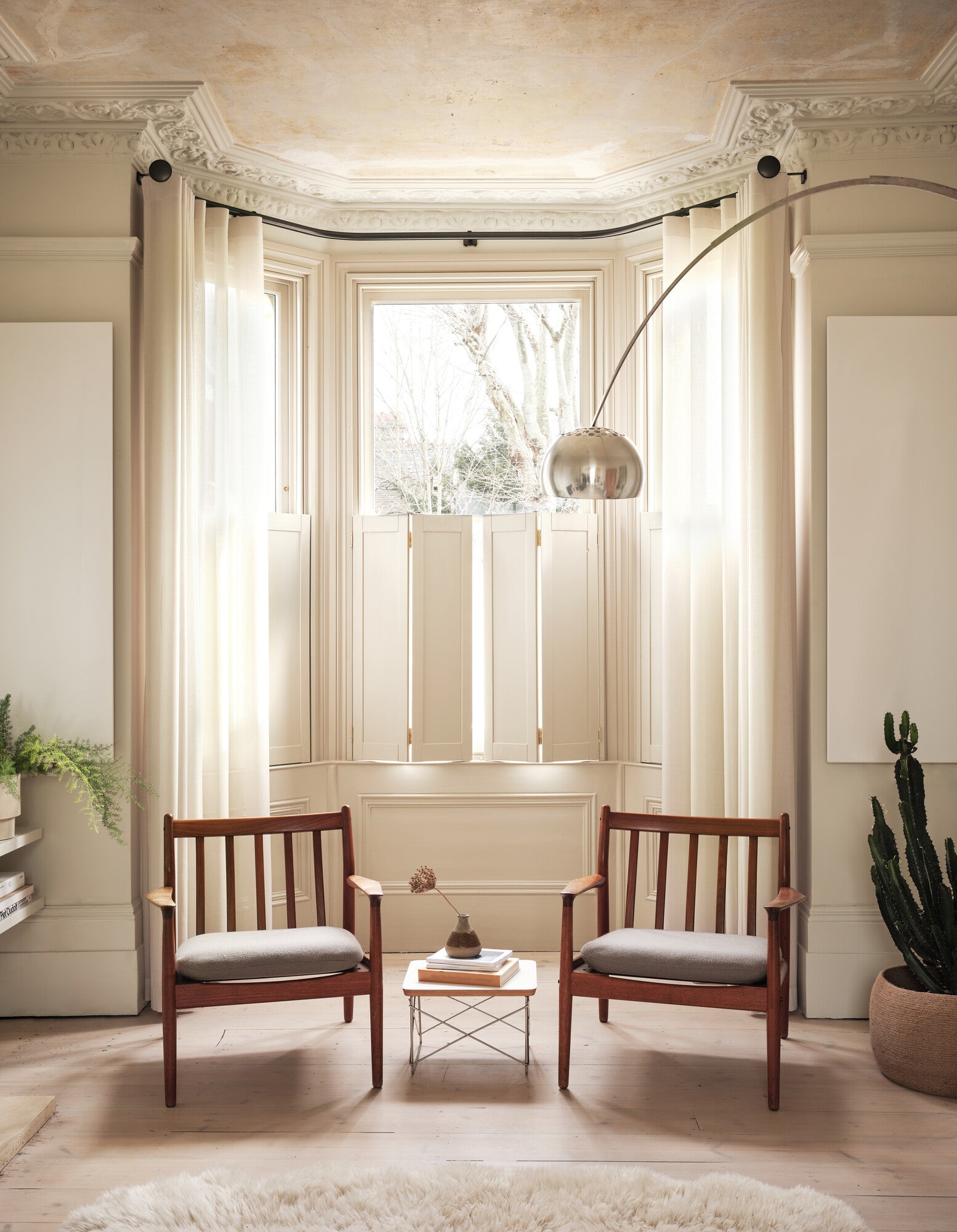 Classic solid wood shutters are suitable for period properties and offer excellent insulation and noise reduction with the added benefit of keeping the room really dark when shut at night. Blackout pleated blinds can be added behind for complete room darkening.
